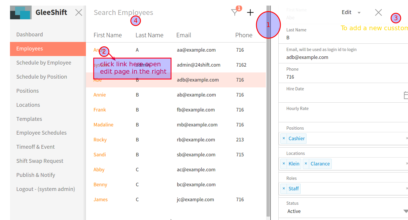 To add a employee, click on the Employees link on the left-side menu. On this page you can manage all of the Employees that are part of your schedule. You can assign position, location and roles to employee.