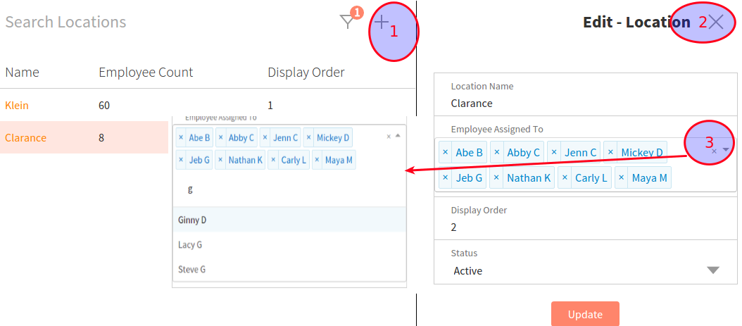 Click the link on each location name to open the edit location page. You can assign employees to this location. To delete a location, set the Status to Delete in the edit page.