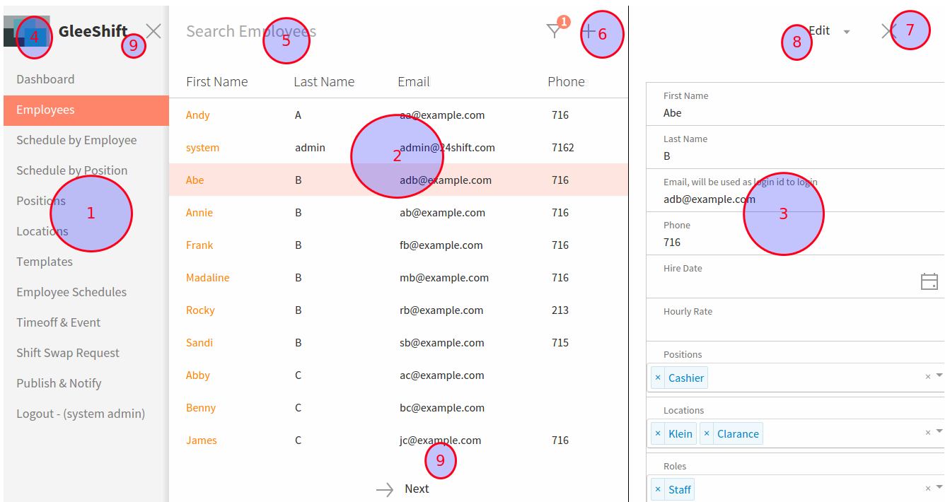 The left panel is the main menu panel (1). It can be closed if you need more space on the right side. Click on the Gleeshift logo icon in the center panel to re-open it (4).