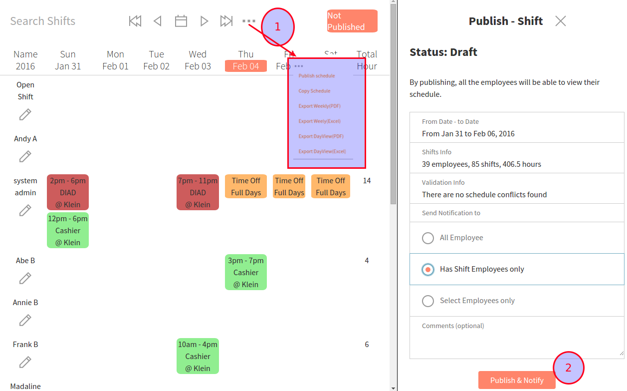 Once you are done with your schedule, you can publish it online as well as send out email notifications to your employees.