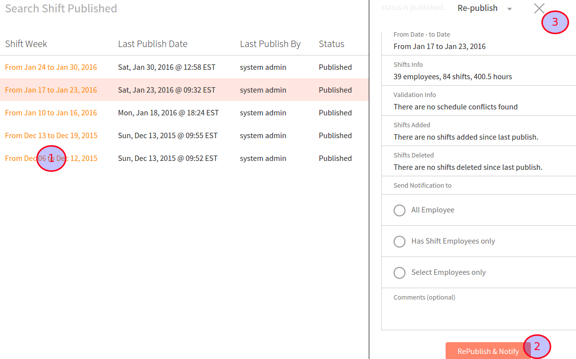 To view published schedules and/or republish schedules, click on the Publish and Notify tab on the left-hand menu. Here, you see the time of each published schedule. By clicking on the orange highlighted date, you can reopen the publish schedule page on the right-hand side.