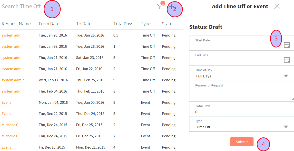 To created a new request, click the + icon in the top right corner. There a Create New Time Off page appears on the right.