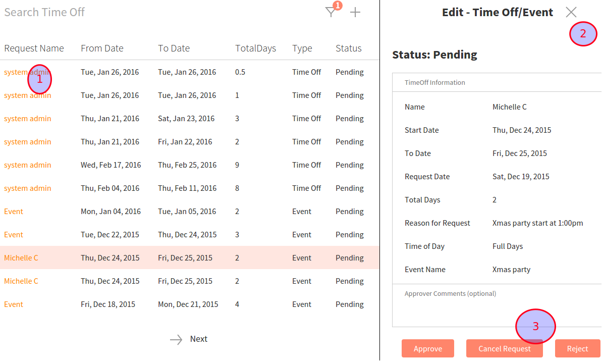 In order to approve or reject requests, click on the request name (highlighted in orange) link. There, a new page appears on the right detailing the days and reason for the request. At the bottom, you can choose to approve, cancel, or reject the request depending on the current status of the request.