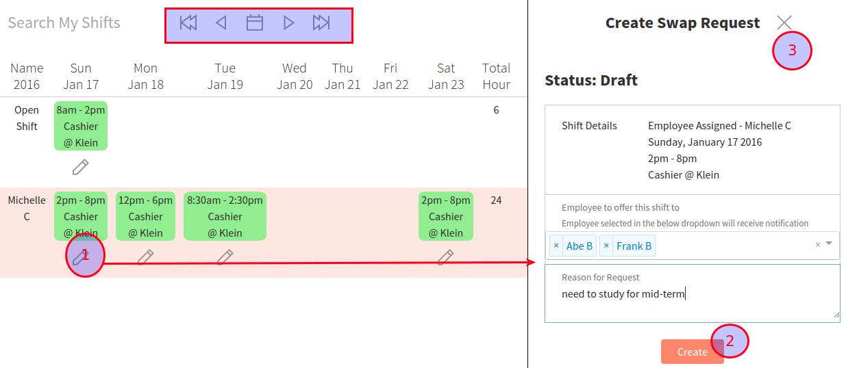 If you can not work on the shift that was scheduled, you can make a swap request by click on the Edit icon (pencil)